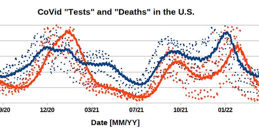 Figure 1. Official Numbers for CoVid “Tests” and CoVid “Deaths” per day in the U.S. over a 2 year period. The solid lines are the 30 day running averages.